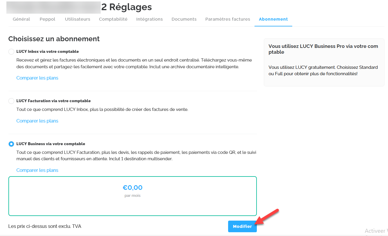 Si votre comptable paie pour votre plan, vous pouvez sélectionner le plan souhaité via le bouton 'Modifier'.