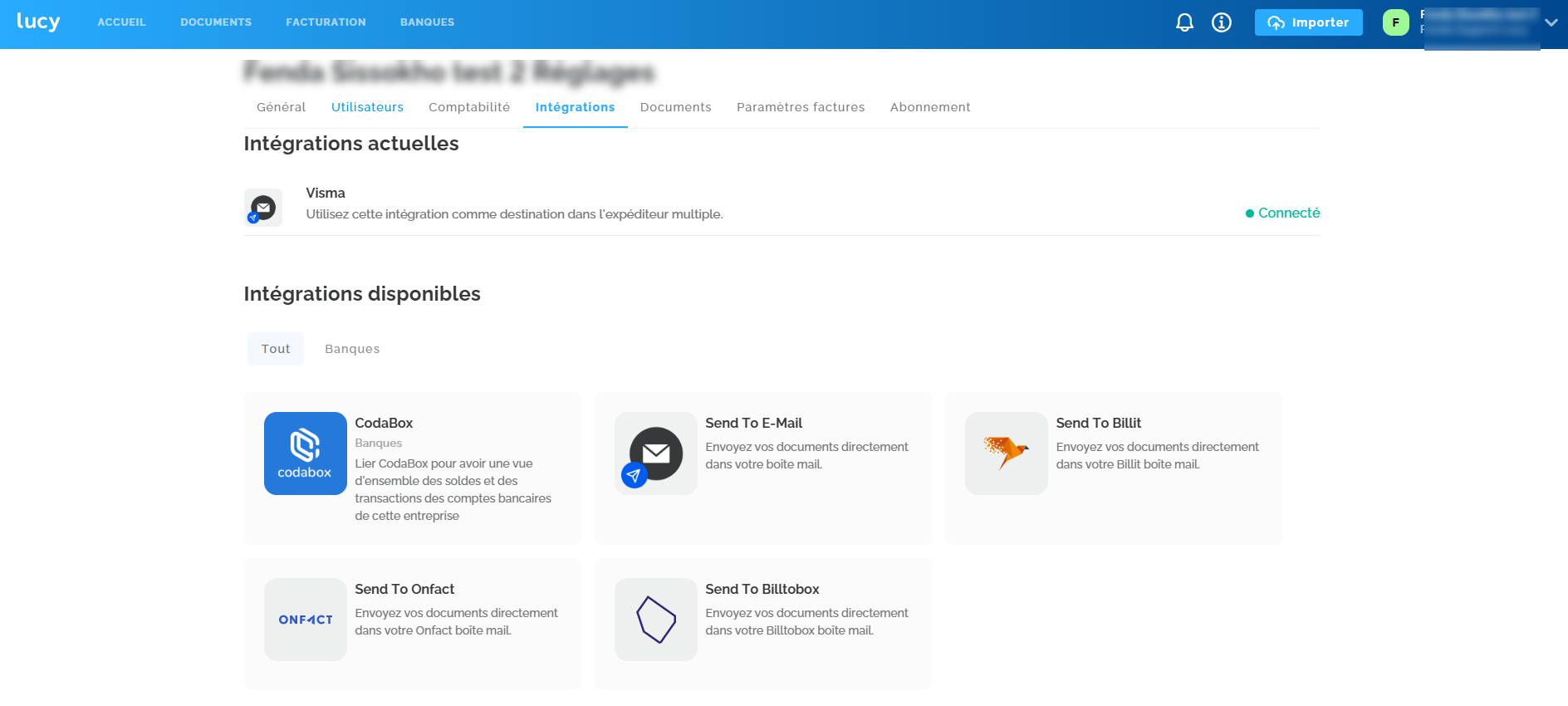 Vous établissez la connexion dans Lucy via Réglages > Intégrations. Codabox figure parmi les intégrations disponibles.