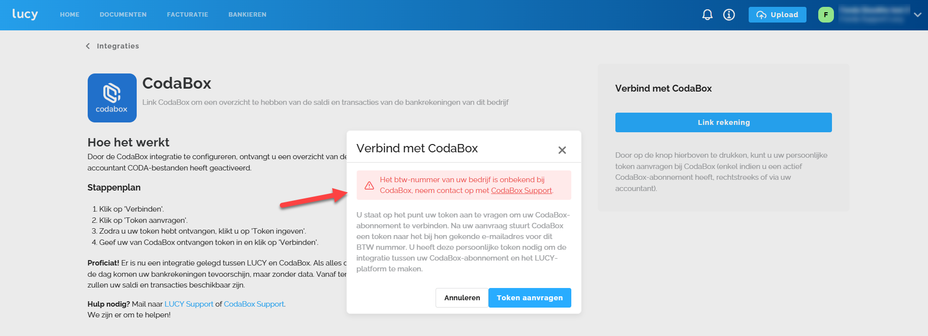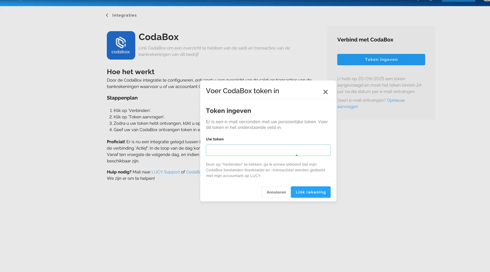 Si un compte Codabox existant est présent pour le numéro de TVA, vous pouvez demander un token dans Lucy.