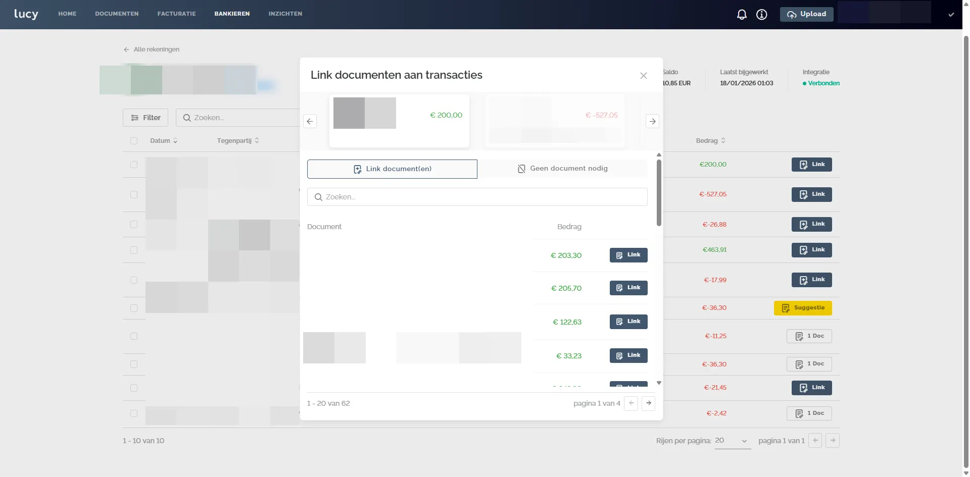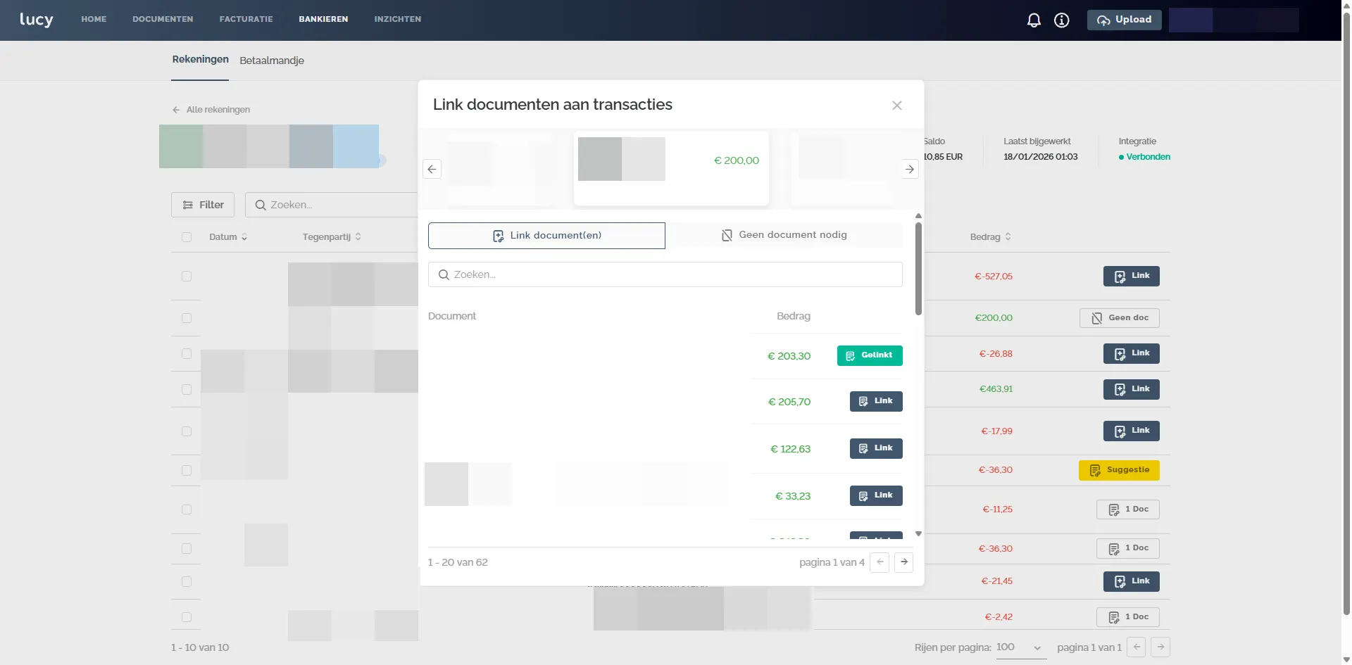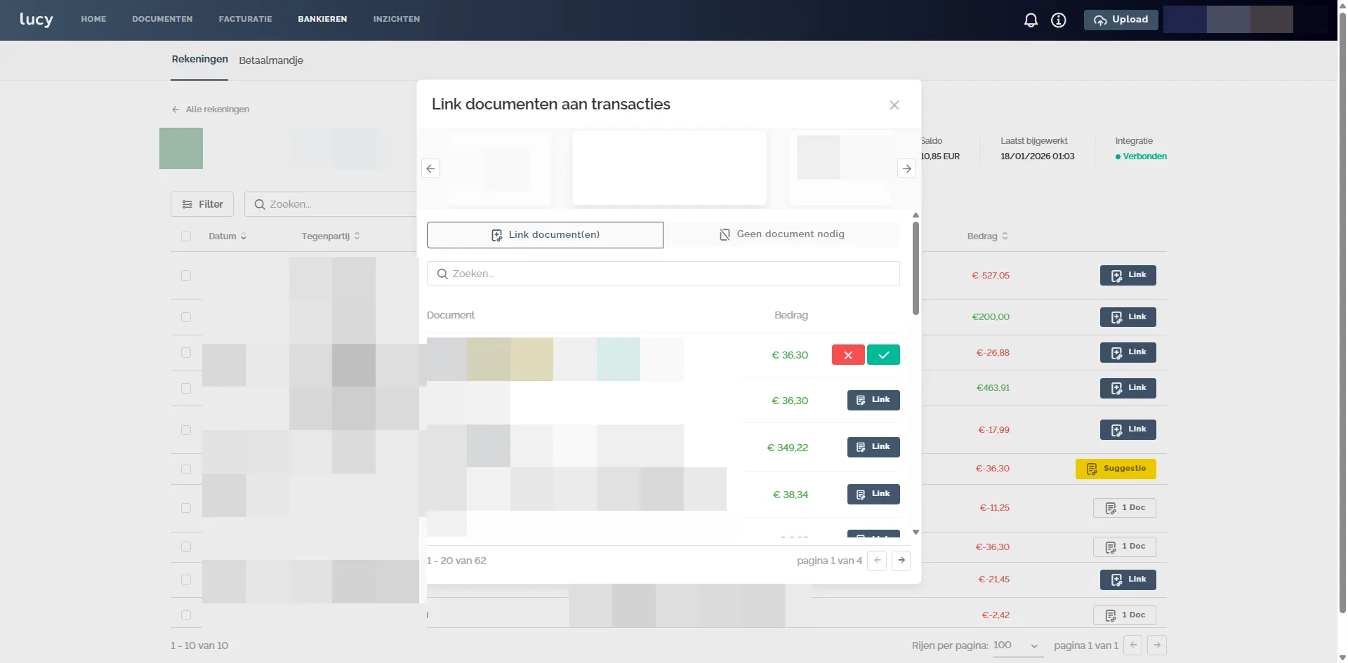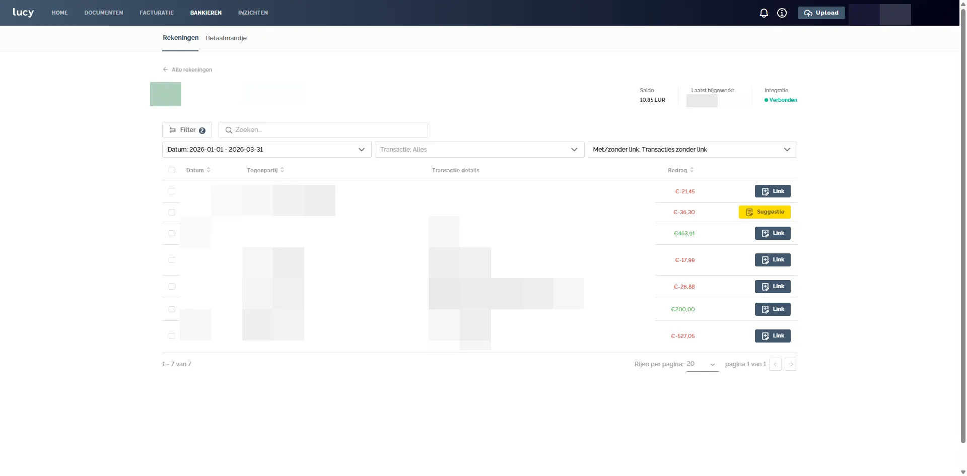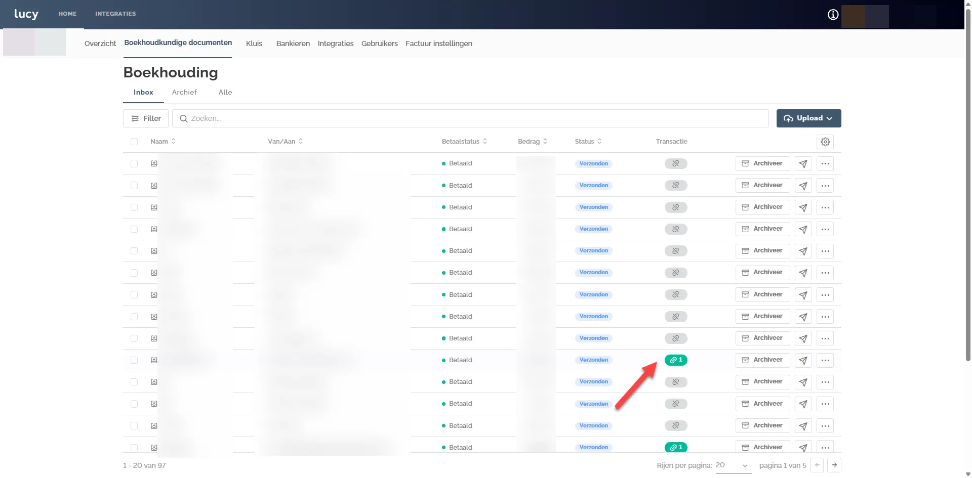 Dans la Boîte de réception, vous voyez immédiatement quels documents sont déjà liés et lesquels ne le sont pas. Vous avez également la possibilité de filtrer par Transactions liées, non liées ou suggérées.