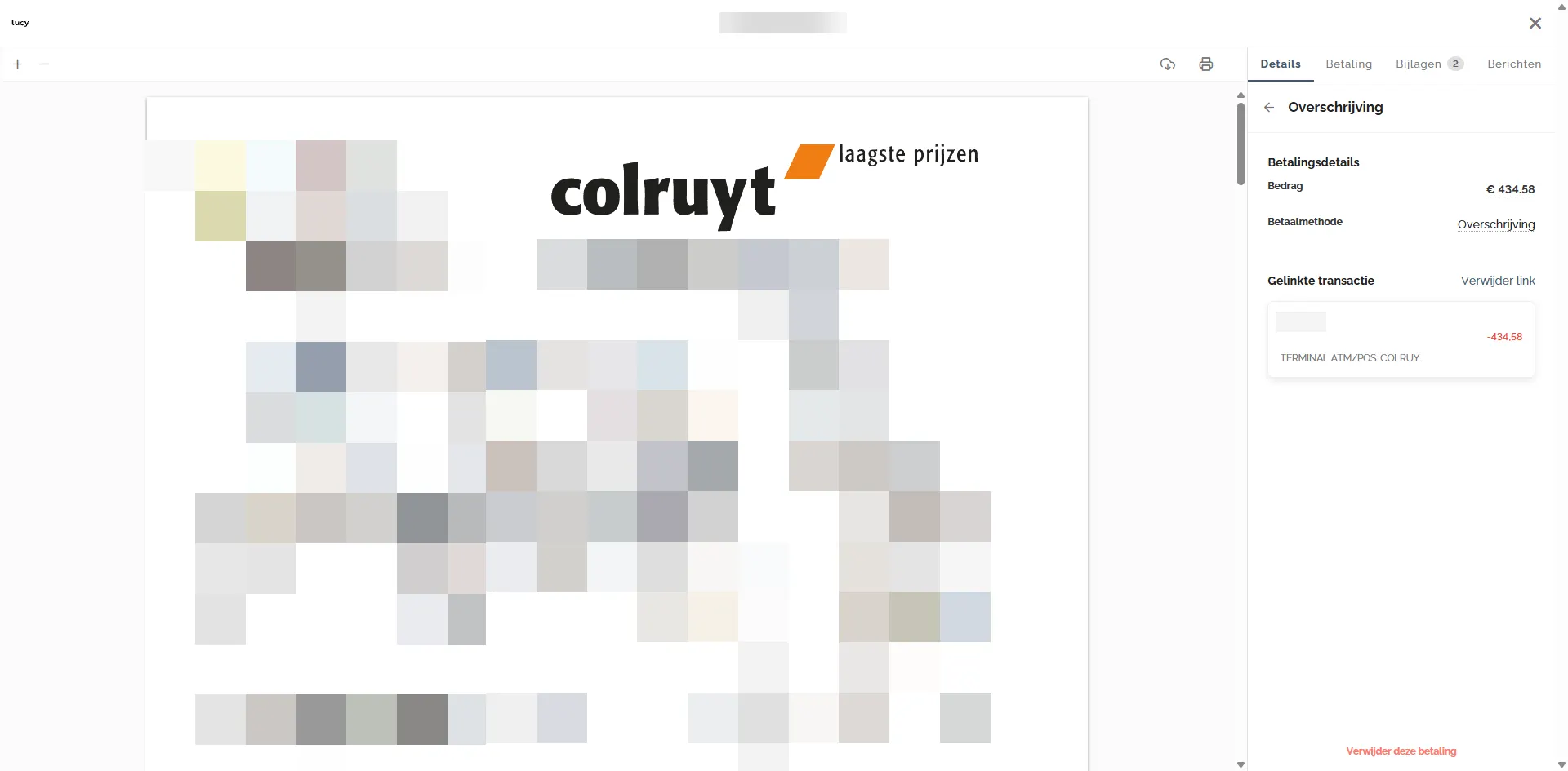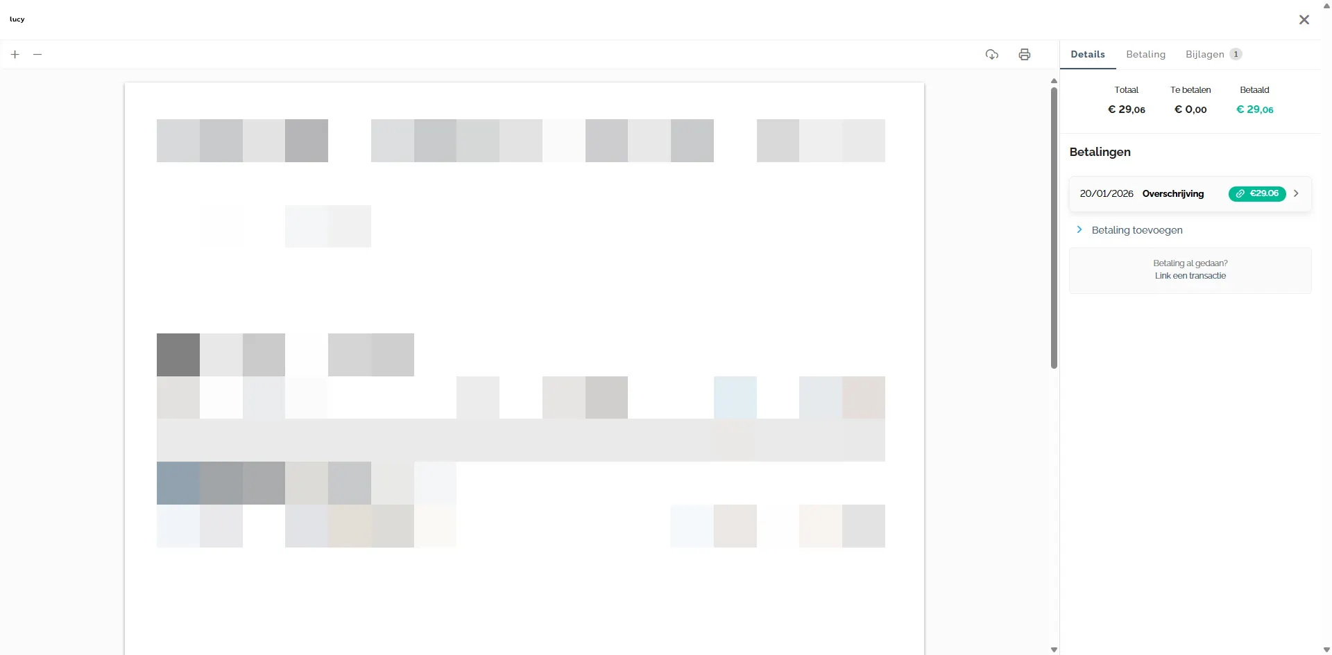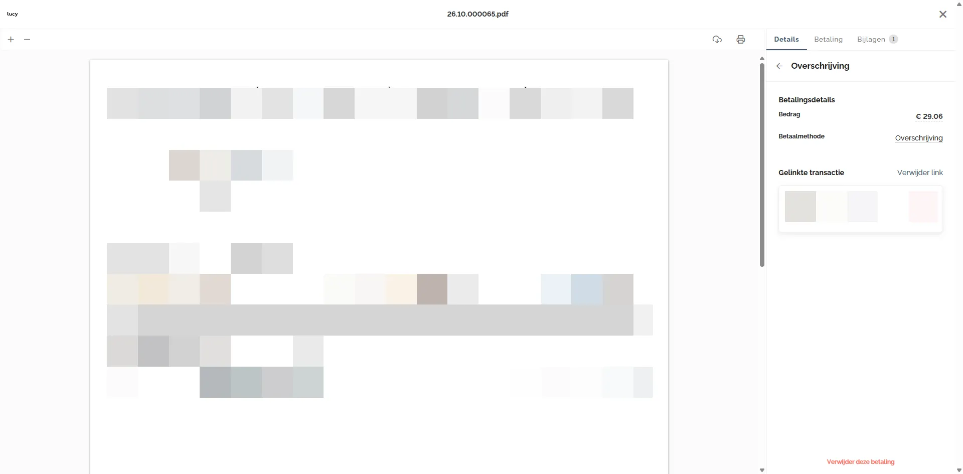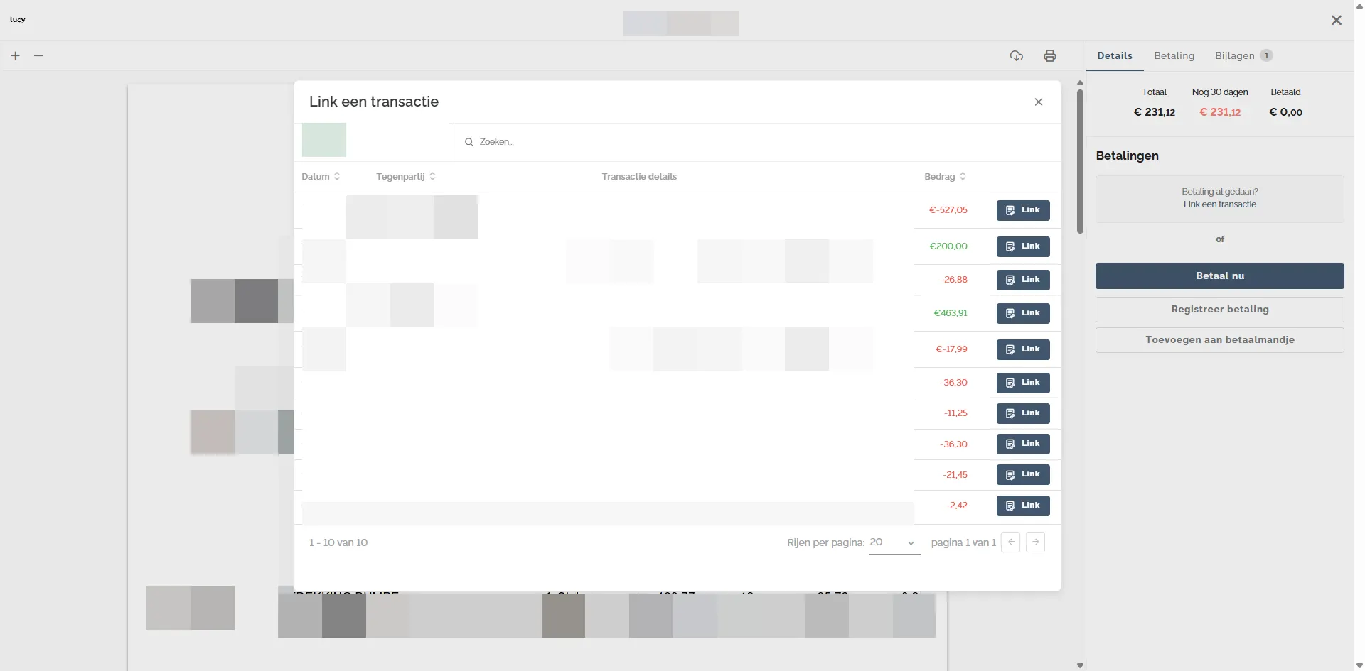 En cliquant sur le lien, vous commencez par cette transaction et vous pouvez voir tous les documents de la Boîte de réception et de l'Archive, payés ou non. Depuis cet écran, vous pouvez lier des transactions à des documents, ce qui les fait disparaître des Documents manquants et les marque comme Payés.
