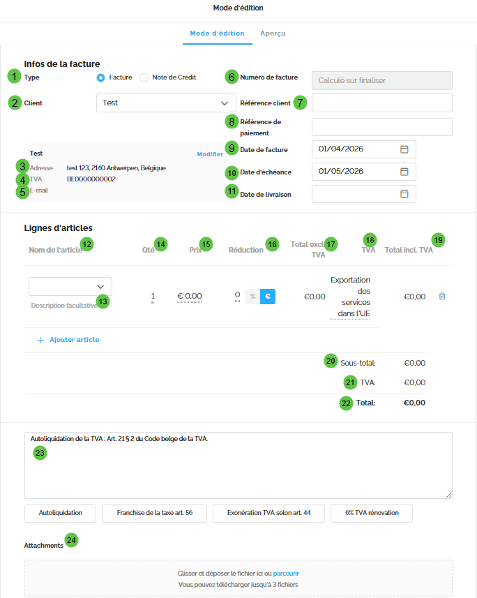 | 11 | Date de livraison (Apparaît lors de la sélection d'un certain taux de TVA) | Actuellement invisible sur le PDF et absent des données XML | ||