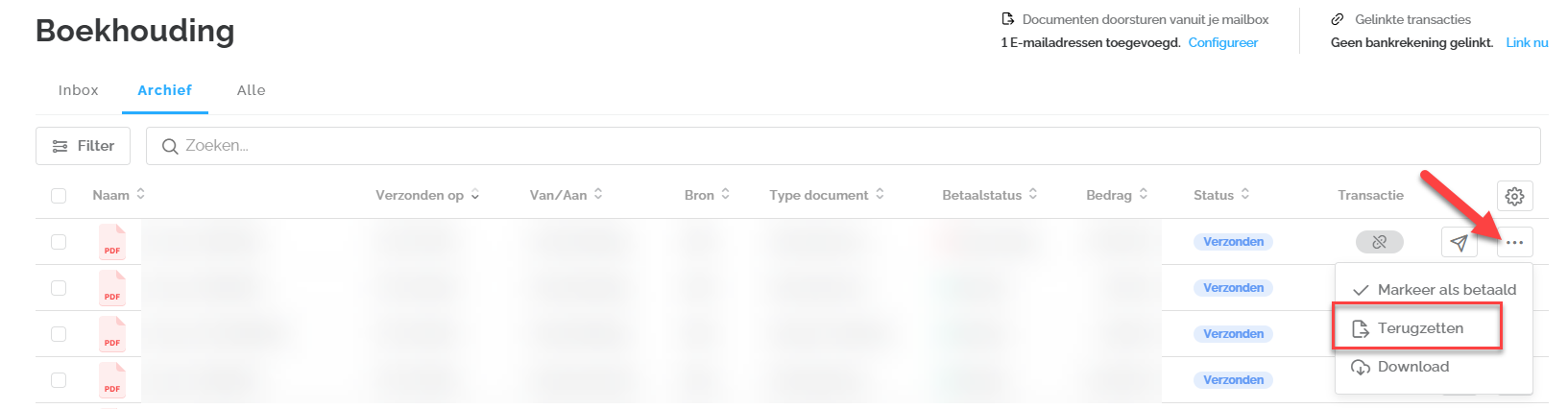 Je kan een gearchiveerd document op elk gewenst moment terugzetten naar je inbox. Klik hiervoor op de drie puntjes (...) naast het document en kies de optie 'Terugzetten'.