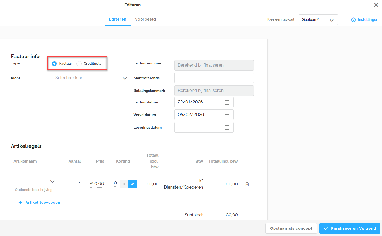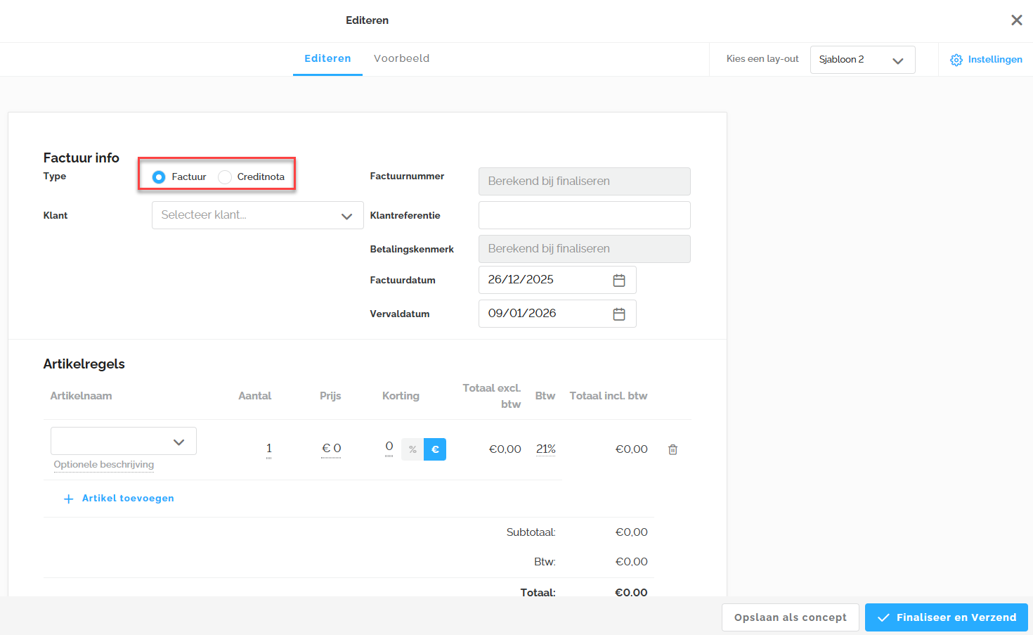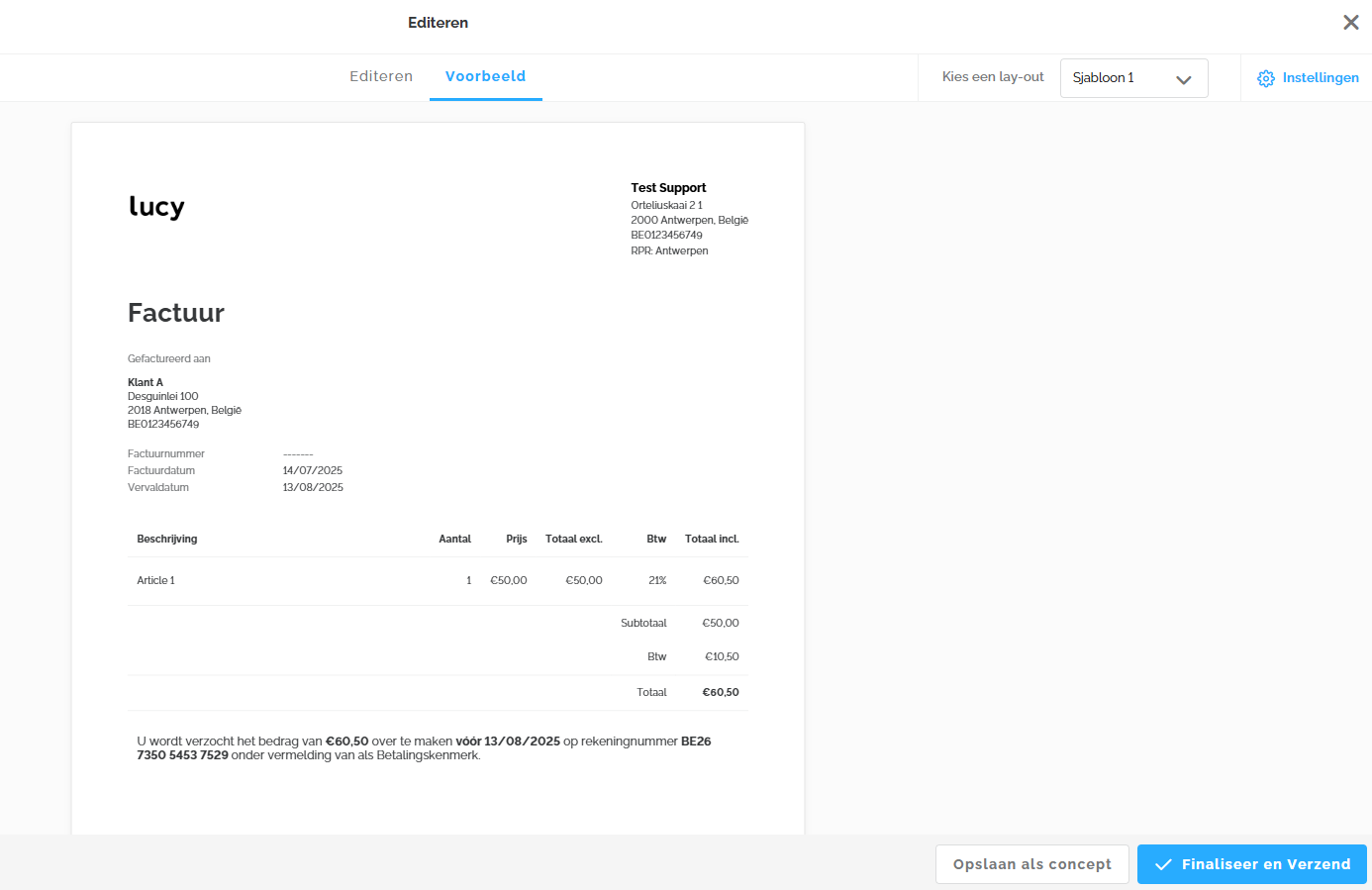 Zodra de factuur klaar is, kan je deze opslaan als concept of finaliseren en verzenden.