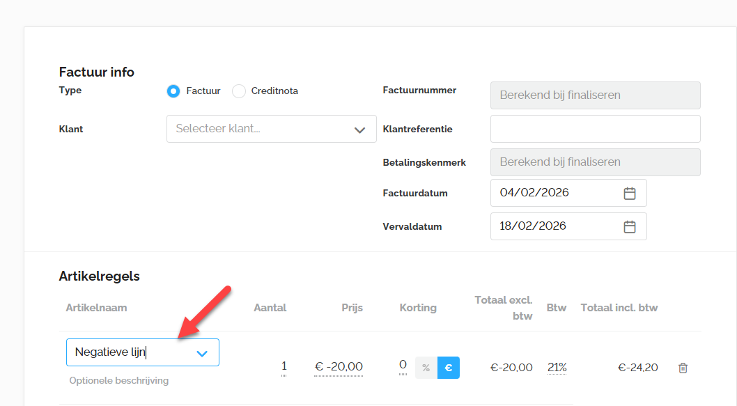 - Het is niet mogelijk om een gefinaliseerde factuur te verwijderen of de inhoud ervan aan te passen. We raden aan om bij correcties aan een gefinaliseerde factuur een creditnota op te maken. Hierdoor blijft uw administratie correct en consistent.