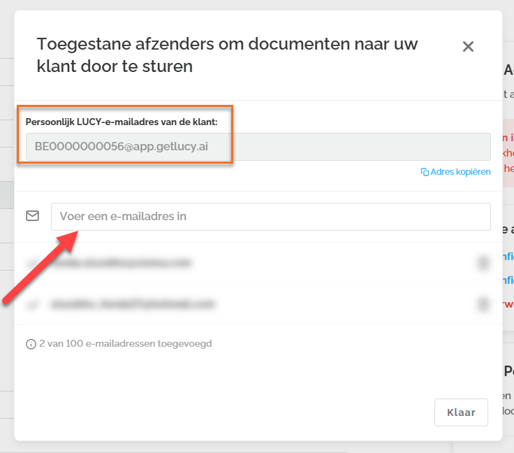 Daarnaast kunt u via de knop 'Configureer toegestane afzenders voor uw klant' het Lucy-e-mailadres van de klant vinden en e-mailadressen van toegestane afzenders toevoegen aan de lijst, zodat hun e-mails in de Lucy-inbox terechtkomen.
