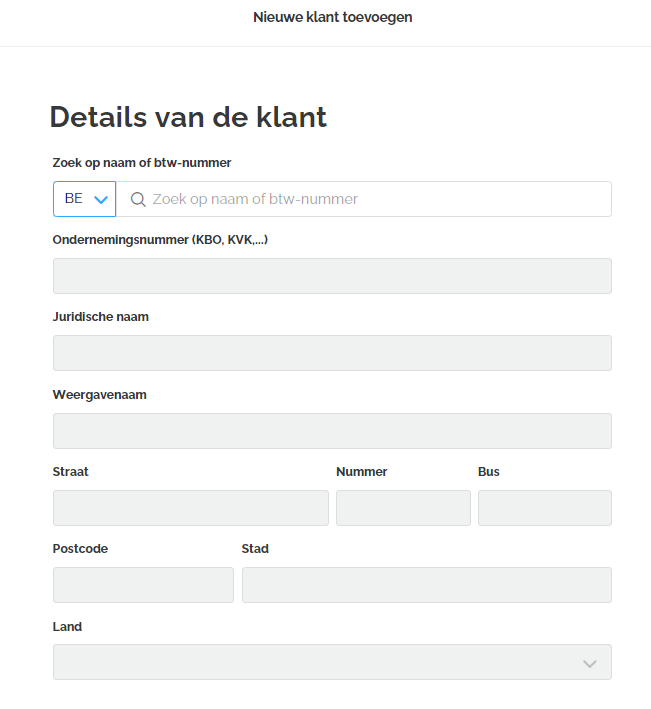Het volgende scherm wordt geopend waarbij je alle gegevens van de klant kan toevoegen. Je kan zoeken op naam of btw-nummer. Dit is gelinkt aan KBO. Bij het selecteren van een klant zal Lucy alle overige velden invullen met de informatie die uit het KBO wordt gehaald.