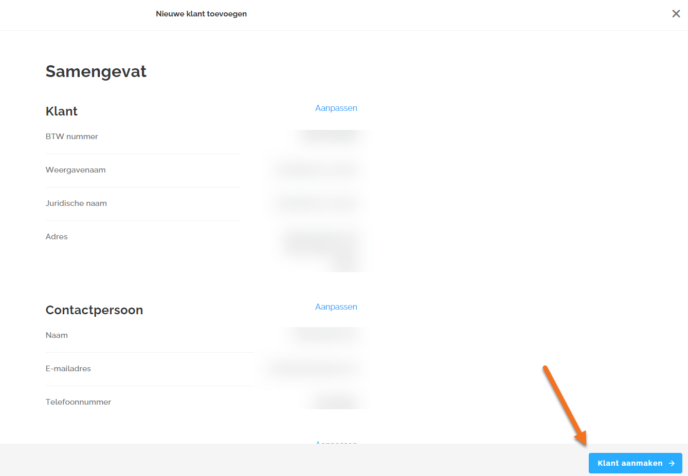 De volgende stap toont een samenvatting waarbij je de optie krijgt om de klant aan te maken.