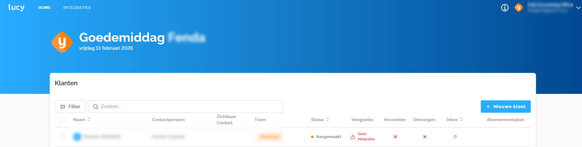 Elke gebruiker die toegang heeft tot de Lucy omgeving kan klanten toevoegen door te klikken op de knop "+ Nieuwe klant".