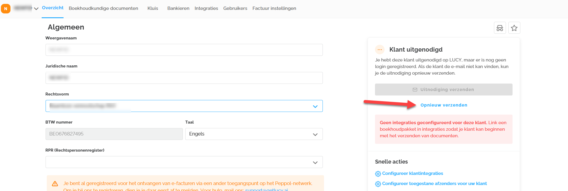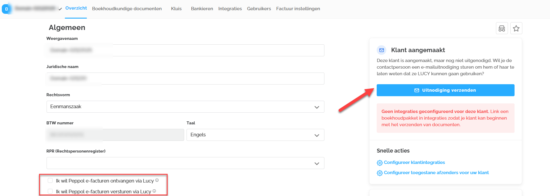Je kan de klant uitnodigen om toegang te verlenen en vanuit dit overzicht kan je Peppol via Lucy aanvinken of afvinken voor het ontvangen en/of verzenden van facturen.