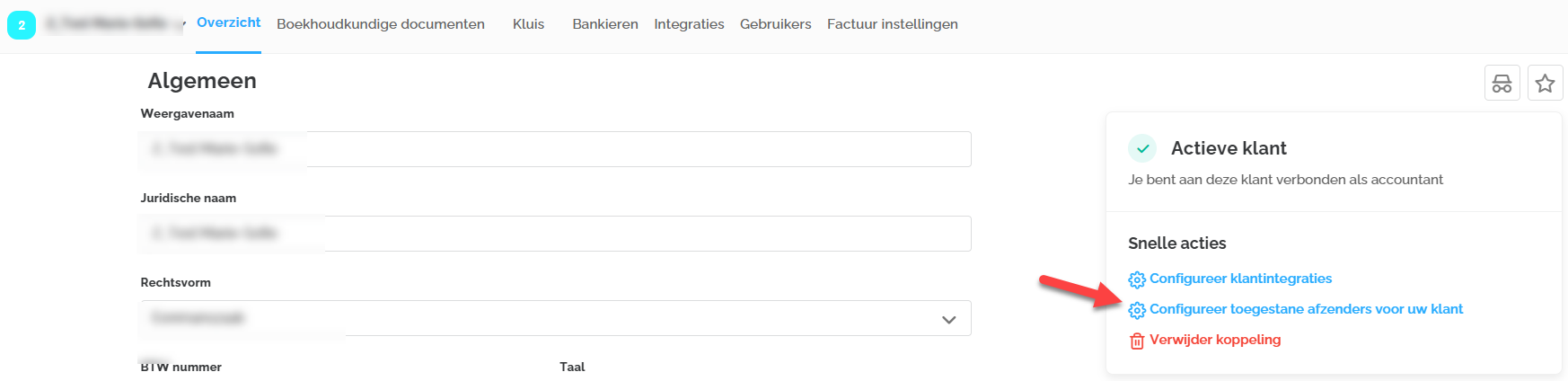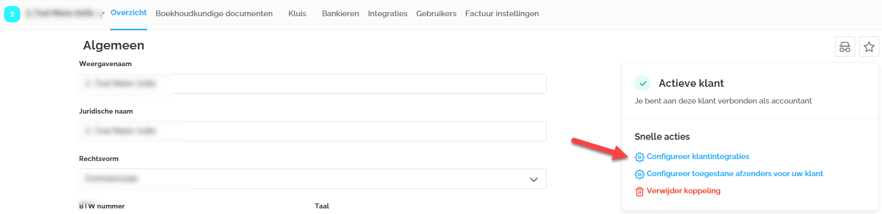 - Koppeling leggen met boekhoudpakket via Integraties - zodat de documenten verstuurd kunnen worden naar de boekhoudsoftware. Het is mogelijk om met één boekhoudpakket te koppelen.