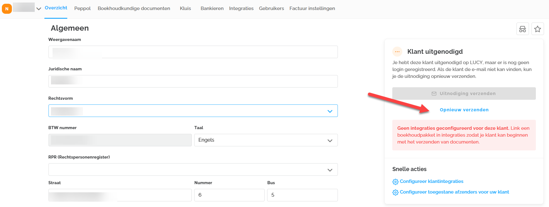 Wanneer een klant een uitnodigingsmail ontvangt, krijgt het dossier de status Uitgenodigd. De link in de e-mail die de klant ontvangt is 21 dagen geldig. Na deze periode kan je de klant een nieuwe uitnodiging sturen door op de knop Opnieuw verzenden te klikken.