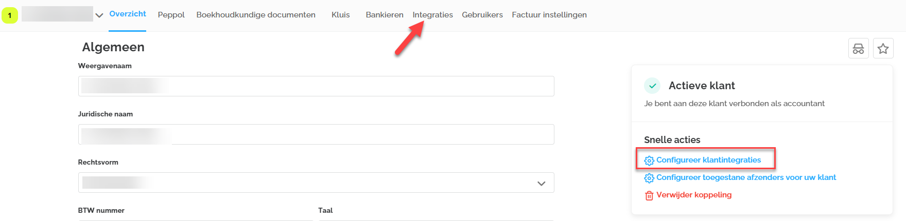 Via de tab Integraties of de knop Configureer klantintegraties bij de tab Overzicht kom je terecht op het onderstaande scherm waar je de mogelijkheid hebt om volgende zaken in orde te brengen: