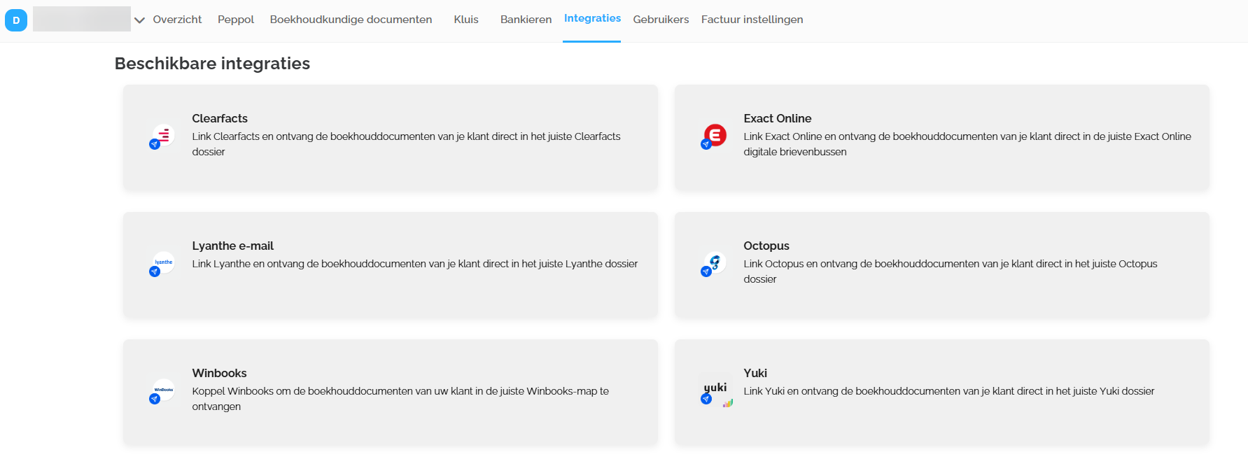 - Koppeling leggen met boekhoudpakket via de bestaande integraties - zodat de documenten verstuurd kunnen worden naar de boekhoudsoftware. Het is mogelijk om met één boekhoudpakket te koppelen.