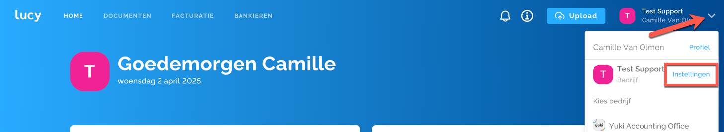 Via de instellingen heb je de mogelijkheid om enkele algemene parameters in te stellen, gebruikers toe te voegen, integraties vast te leggen en jouw Lucy abonnement uit te kiezen. Klik rechtsbovenaan op de naam van jouw omgeving en vervolgens op de knop 'Instellingen'.