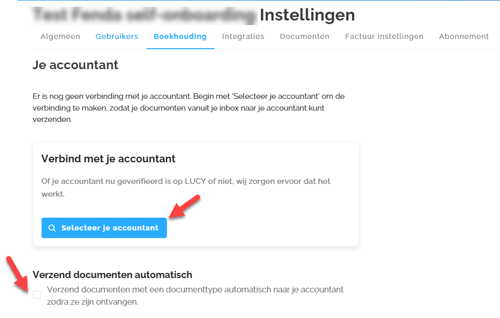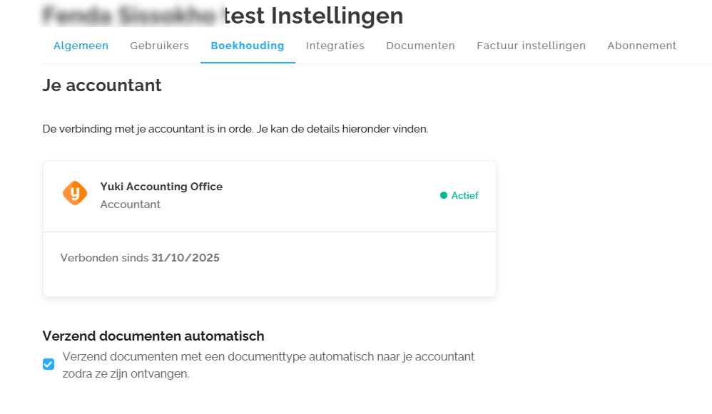 Onder de tab 'Boekhouding' kun je controleren of de verbinding met je accountant correct is en sinds wanneer deze actief is. Als je accountant je dossier in Lucy heeft geregistreerd, worden deze gegevens automatisch ingevuld. Door de optie 'Verzend documenten automatisch' in te schakelen, worden alle documenten in je inbox automatisch doorgestuurd naar je boekhoudpakket.