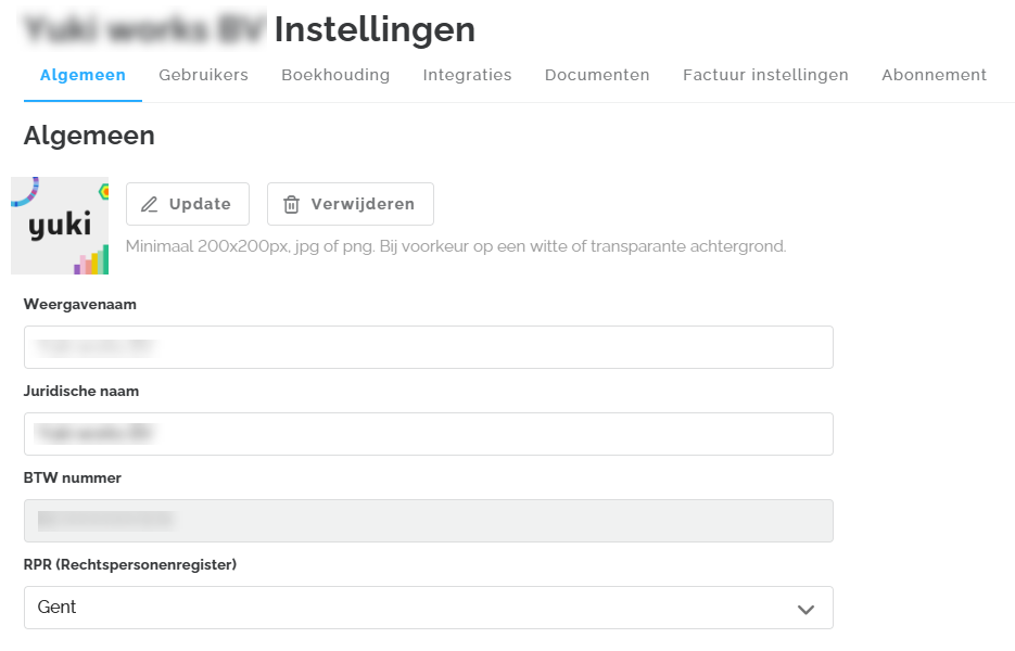 Onder de tab 'Algemeen' kun je een logo toevoegen aan je Lucy-omgeving. Dit logo kan op elk moment vervangen of verwijderd worden. Daarnaast heb je de mogelijkheid om de weergavenaam en de juridische naam in te stellen of aan te passen indien nodig. Het btw-nummer kan echter niet gewijzigd of verwijderd worden; voor aanpassingen hieraan moet contact worden opgenomen met de supportafdeling. Onderaan deze tab vind je ook de adresgegevens van je onderneming.