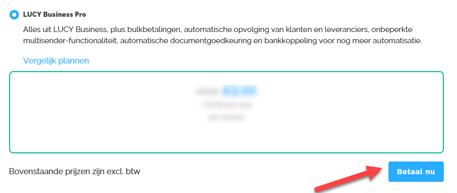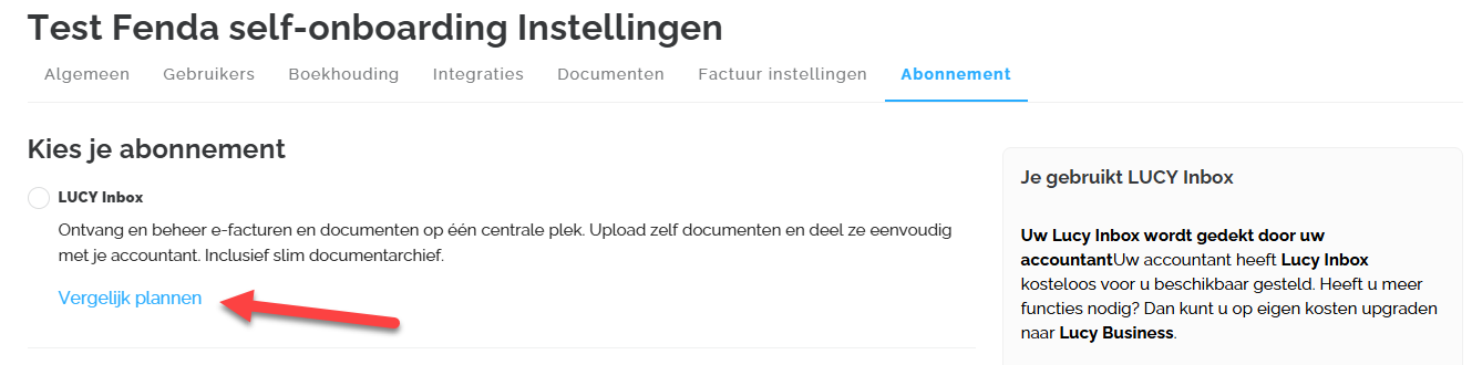 Tenslotte kan je onder tab 'Abonnement' jouw Lucy plan uitkiezen. De verschillende Lucy abonnementen zijn de volgende: Lucy Inbox (niet beschikbaar via Self-onboarding), Lucy Facturatie, Lucy Business & Lucy Business Pro.