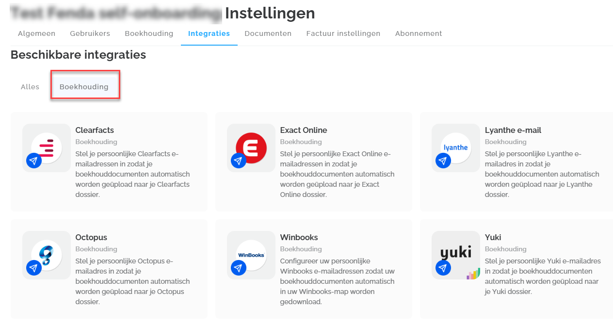 Dit zijn de bestaande integraties: Clearfacts, Exact Online, Lyanthe e-mail, Octopus, Winbooks, Exact Online NL, FTPS, Yuki, Wings, Zenvoices.