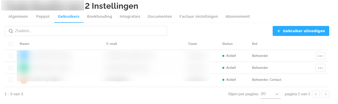 Onder de tab Gebruikers kan je een overzicht terugvinden van de verschillende gebruikers die toegang hebben tot jouw Lucy dossier. Via de knop '+ Gebruiker uitnodigen' kan je een nieuwe gebruiker aanmaken en uitnodigen. Het toevoegen van een extra gebruiker is alleen mogelijk met Lucy Business en Lucy Business Pro, tegen een maandelijkse vergoeding van 2,50 euro per maand.