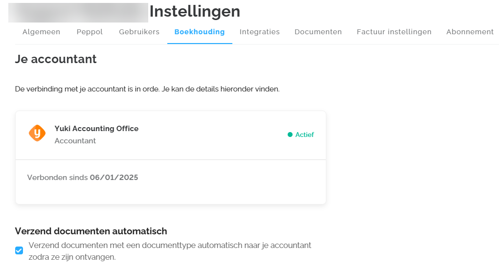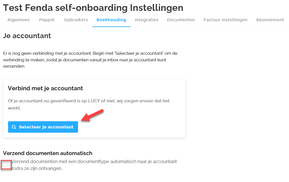 Als je je bedrijf zelf hebt geregistreerd via de Self-onboarding, kun je hier zelf je accountant selecteren. Werk je niet samen met een accountant, dan kun je je eigen bedrijf als accountant instellen. Dit is essentieel om ervoor te zorgen dat de documenten automatisch naar je boekhoudintegratie worden doorgestuurd, mits je deze optie hebt ingeschakeld.