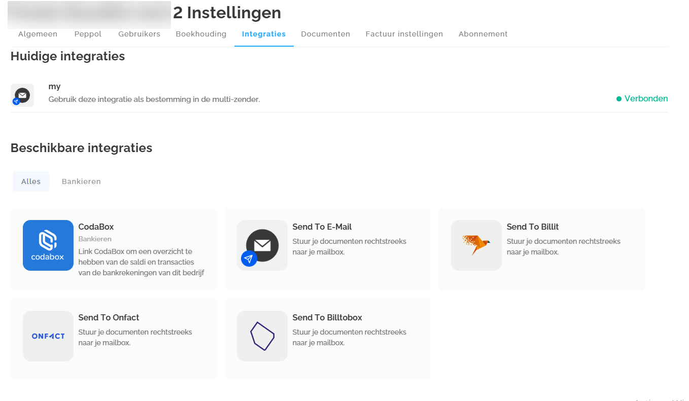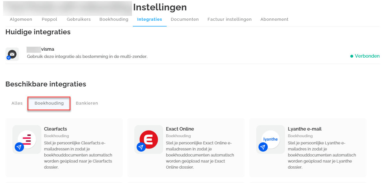 Onder de tab Integraties kun je verbinding maken met je privé-e-mailadres of een andere bestemming. Deze bestemmingen verschijnen automatisch in de multisender. De beschikbare integraties met boekhoudpakketten zijn niet zichtbaar voor ondernemers van wie het dossier door de accountant in Lucy is geregistreerd. Dit komt omdat de accountant verantwoordelijk is voor het instellen van de integratie met jouw boekhoudpakket.