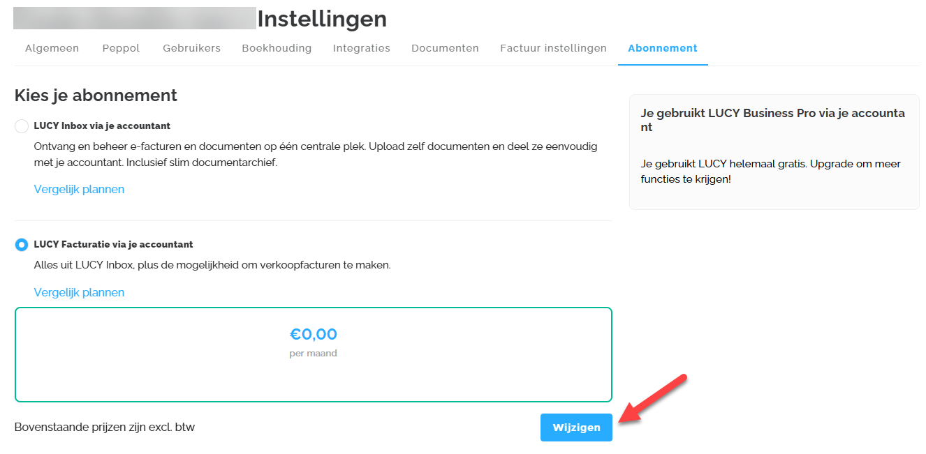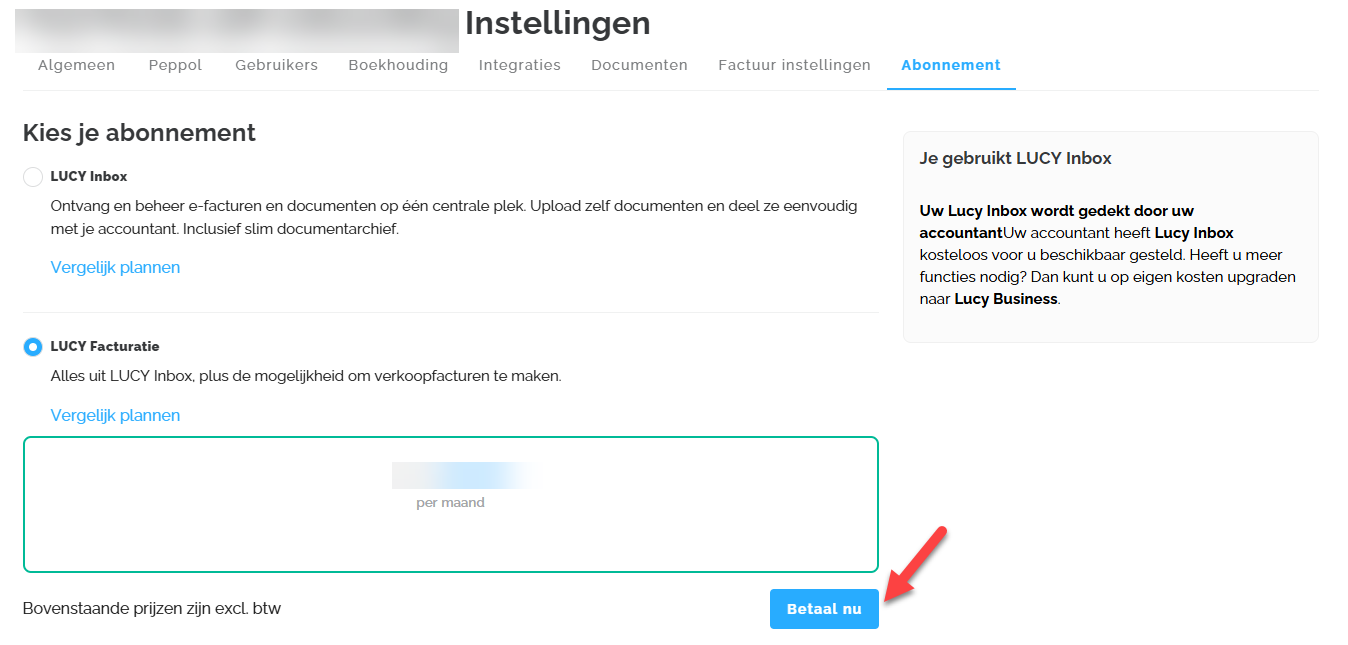 Tenslotte kan je onder de tab Abonnement jouw Lucy plan uitkiezen. De verschillende Lucy abonnementen zijn de volgende: Lucy Inbox (niet beschikbaar via Self-onboarding), Lucy Facturatie, Lucy Business & Lucy Business Pro.