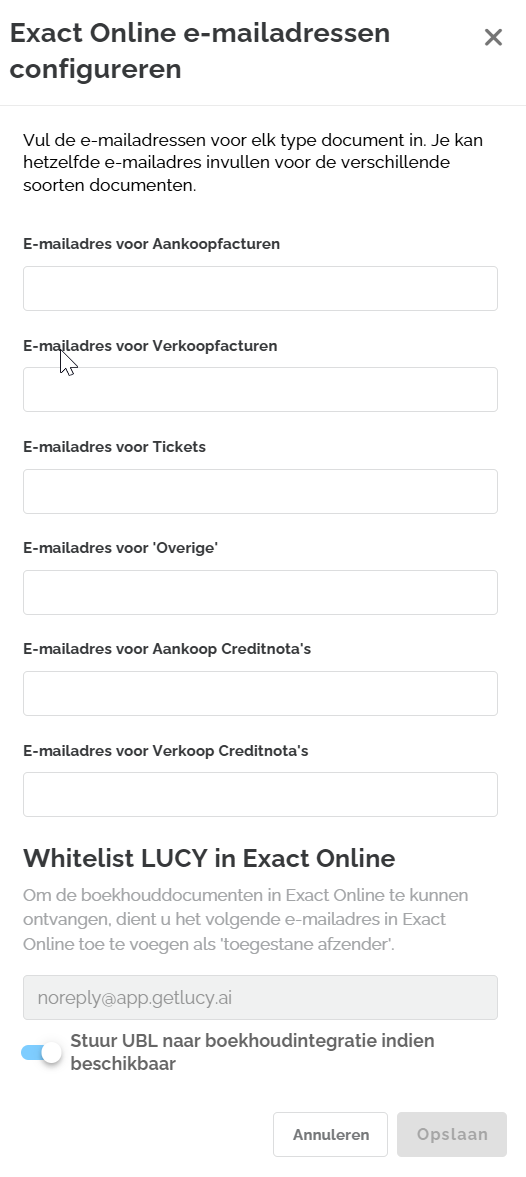 Deze integratie zal gebruik maken van de mogelijkheden van EOL om via specifieke e-mailadressen specifieke documenten te ontvangen. Je dient de juiste e-mailadressen op te halen uit EOL en deze hier te plakken.