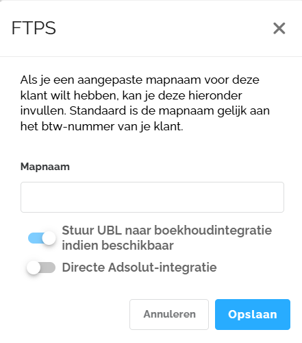 Dit is ook de mapnaam hoe ze bij jullie op de locale server zal komen. Als je geen naam kiest, zal het BTW-nummer gekozen worden. Spreek dus structureel op kantoor af of je een interne code of de BTW-nummer zal gebruiken.