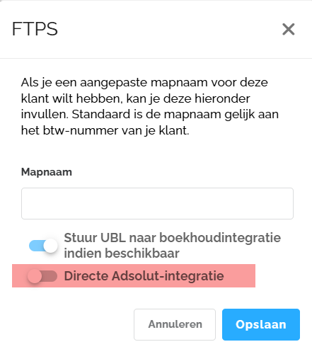 De 'Directe Adsolut-integratie' schakelaar mag ALLEEN aan staan als je een integratie legt met Adsolut. De koppeling zal NIET werken als deze instelling verkeerd staat.
