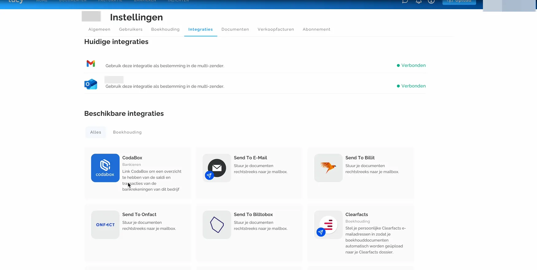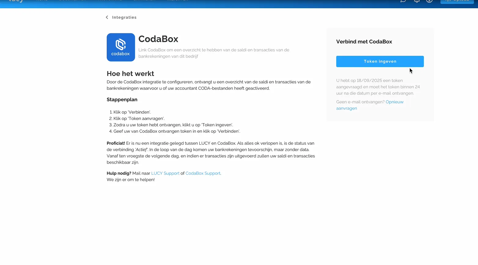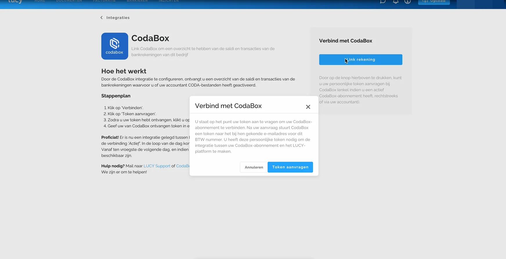Je legt de koppeling in Lucy via Instellingen > Integraties. Daar staat Codabox bij de beschikbare integraties.