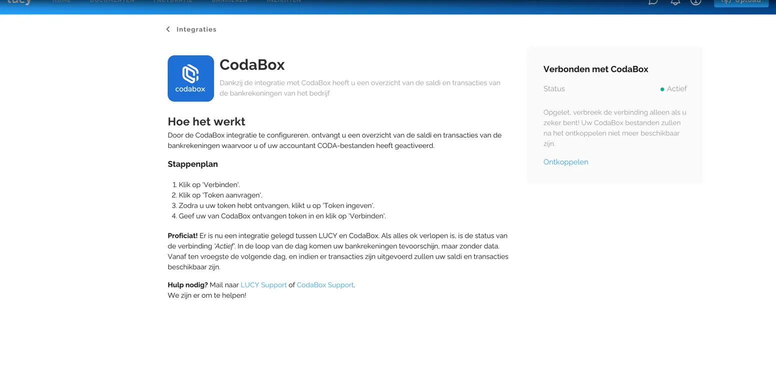De koppeling vervangt het bestaande Codabox-account dat gekoppeld is aan je boekhoudpakket niet. De transacties worden via dit bestaande Codabox-account naar Lucy gestuurd.