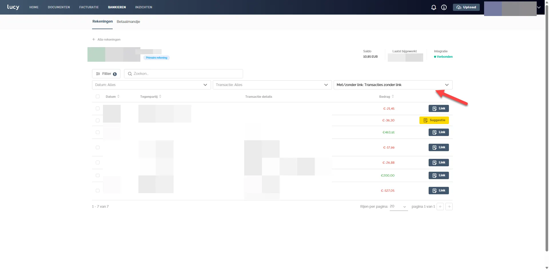 Indien je doorklikt op de 7 bij de Ontbrekende docs, kom je terecht op Bankieren > Rekeningen op de primaire rekening met als filter 'het kwartaal en Transacties zonder link'.
