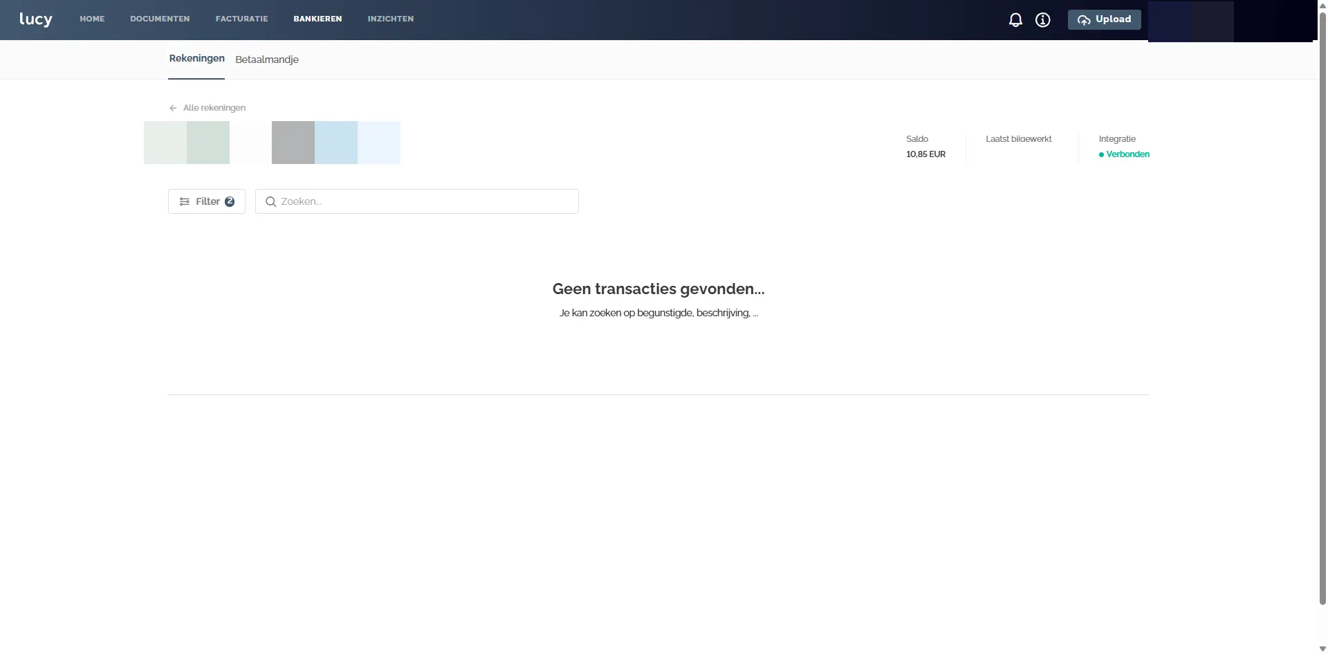 Onder deze tab kun je de gekoppelde rekeningen terugvinden. Van hieruit kun je de transacties koppelen aan een factuur. Wanneer de status van je Codabox-koppeling 'Actief' is, kunnen je bankrekeningen tot 48 uur later zichtbaar worden onder 'Bankieren'.