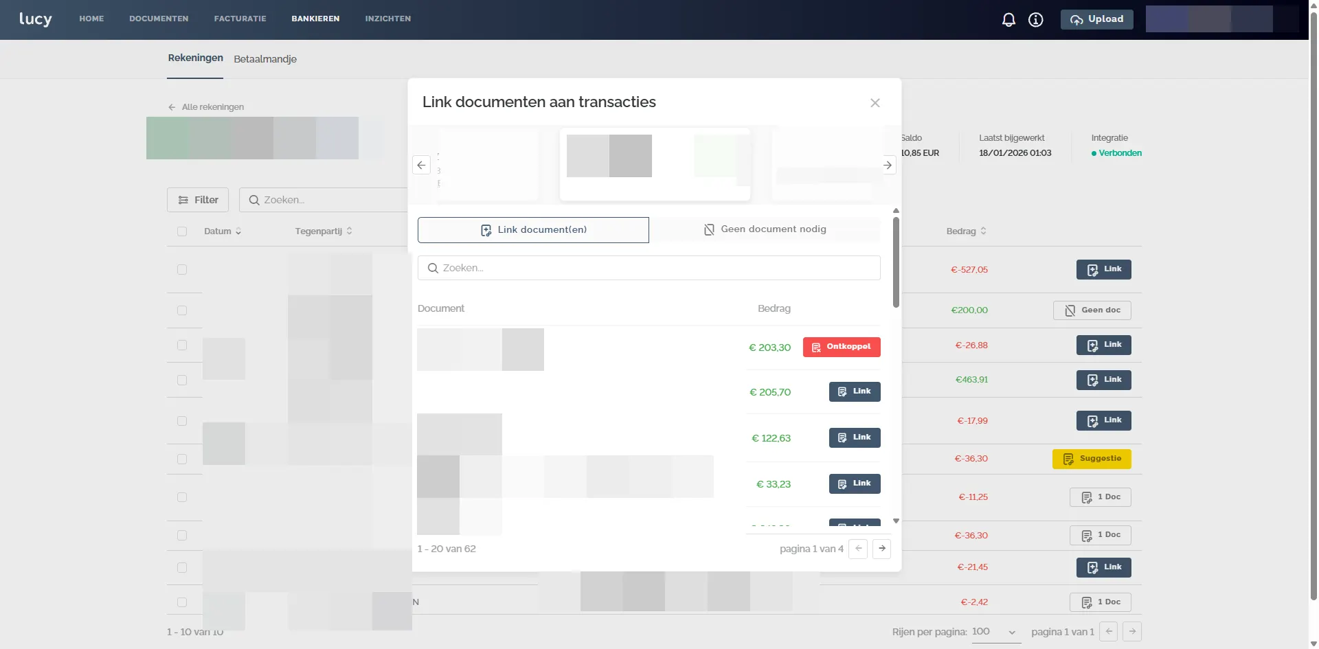 - Link (blauw): Transacties die nog niet aan een document zijn gekoppeld.