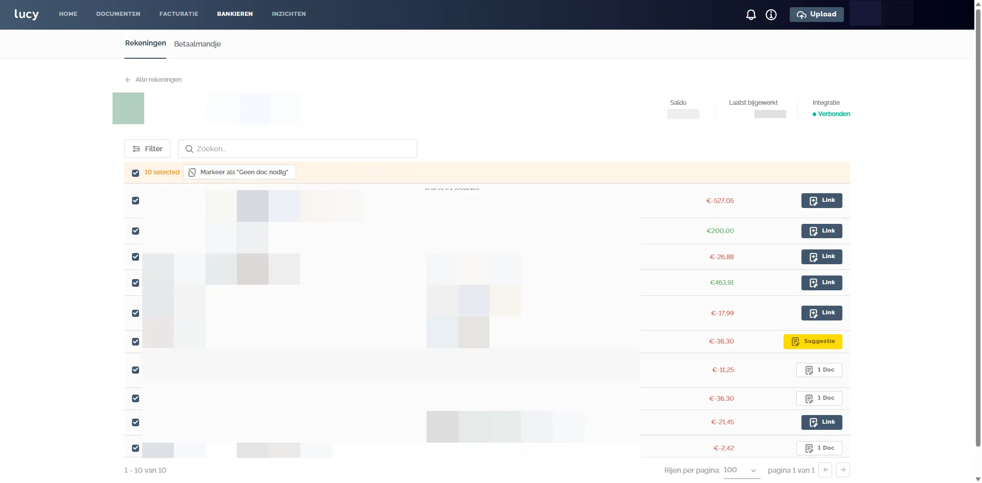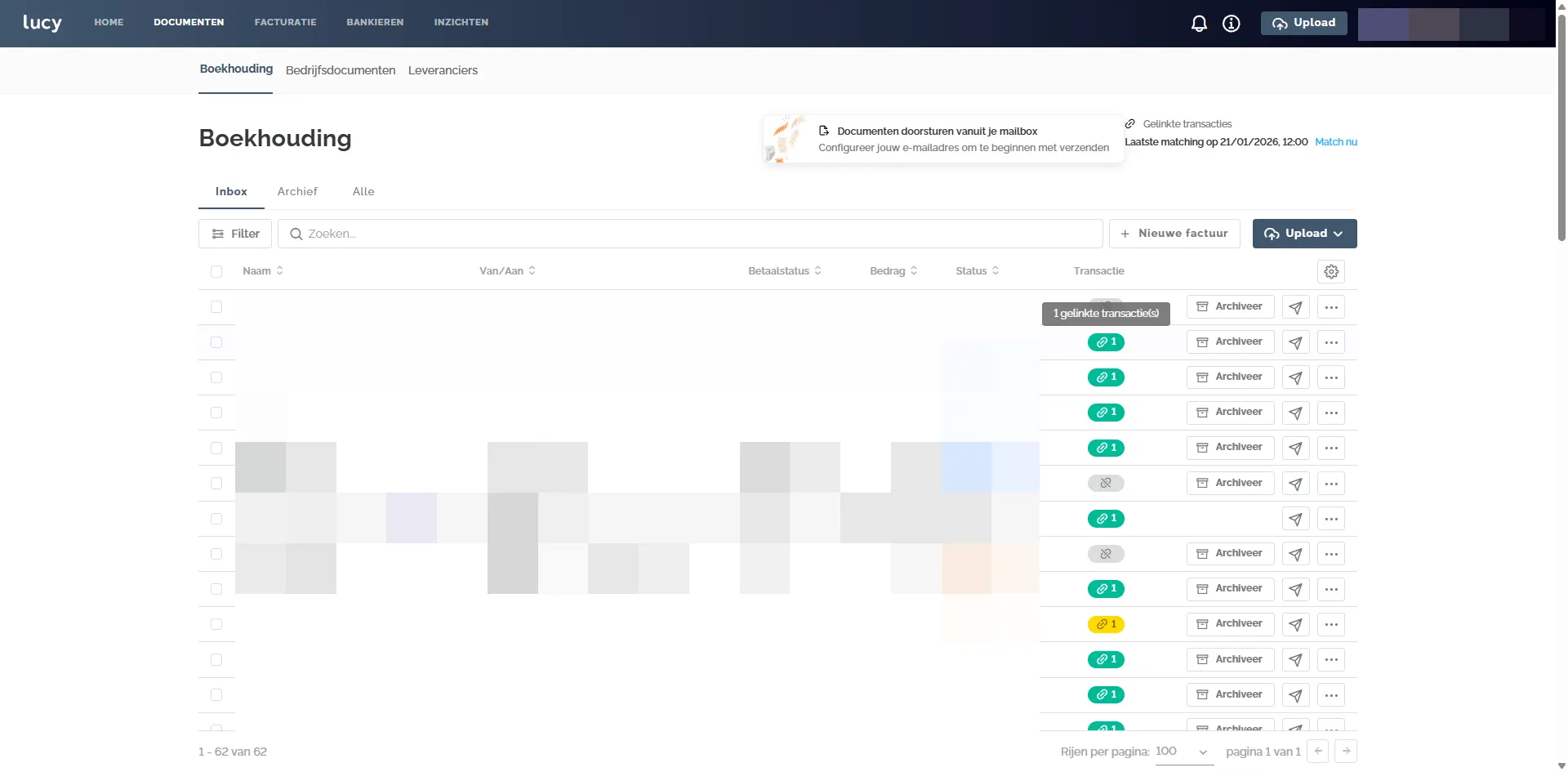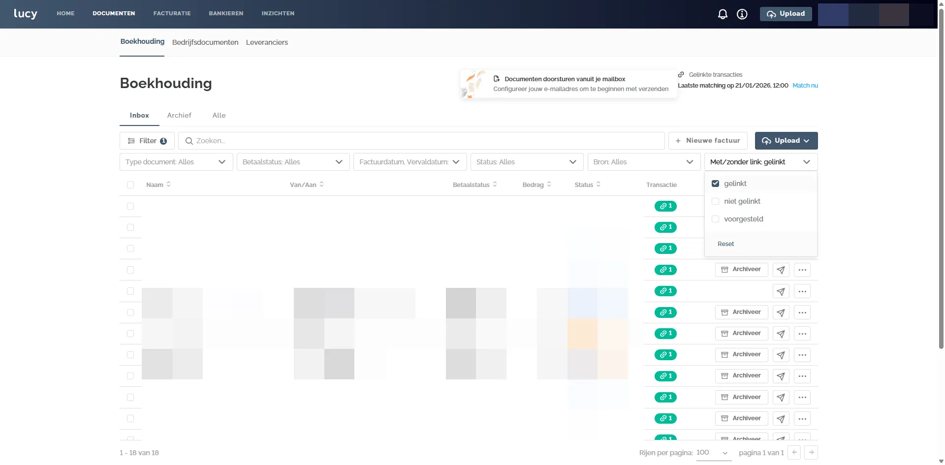 In de Inbox zie je meteen welke documenten reeds gelinkt zijn, en welke niet. Je hebt ook de mogelijkheid om hier te filteren op de Gelinkte, niet gelinkte, of voorgestelde transacties.