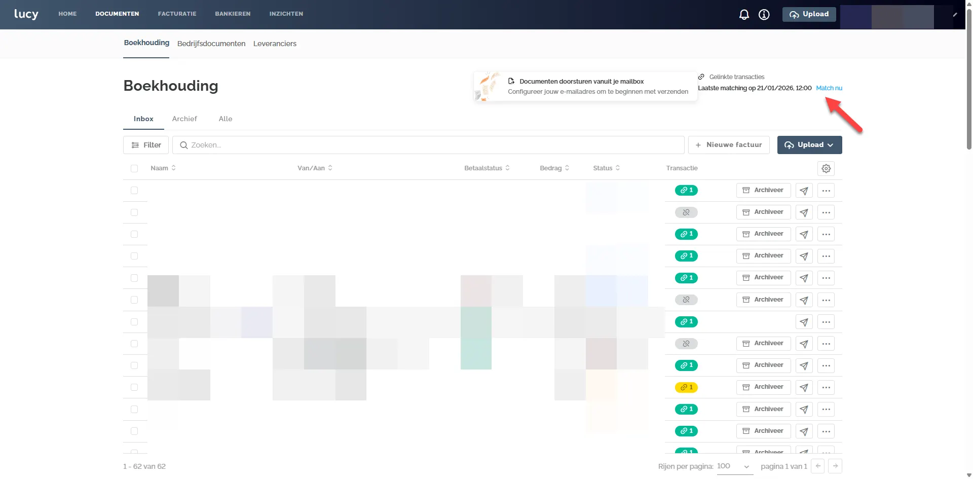 Wanneer de Codabox-koppeling geactiveerd is, verschijnt er iets nieuws op de Inbox-pagina. Rechtsbovenaan zie je nu wanneer de laatste matching is gebeurd, en heb je de mogelijkheid om de matching manueel te laten lopen via de optie Match nu. Standaard worden de geïmporteerde transacties met de aanwezige documenten 4 keer per dag om de 6 uur automatisch gematcht op basis van het gewichtensysteem.