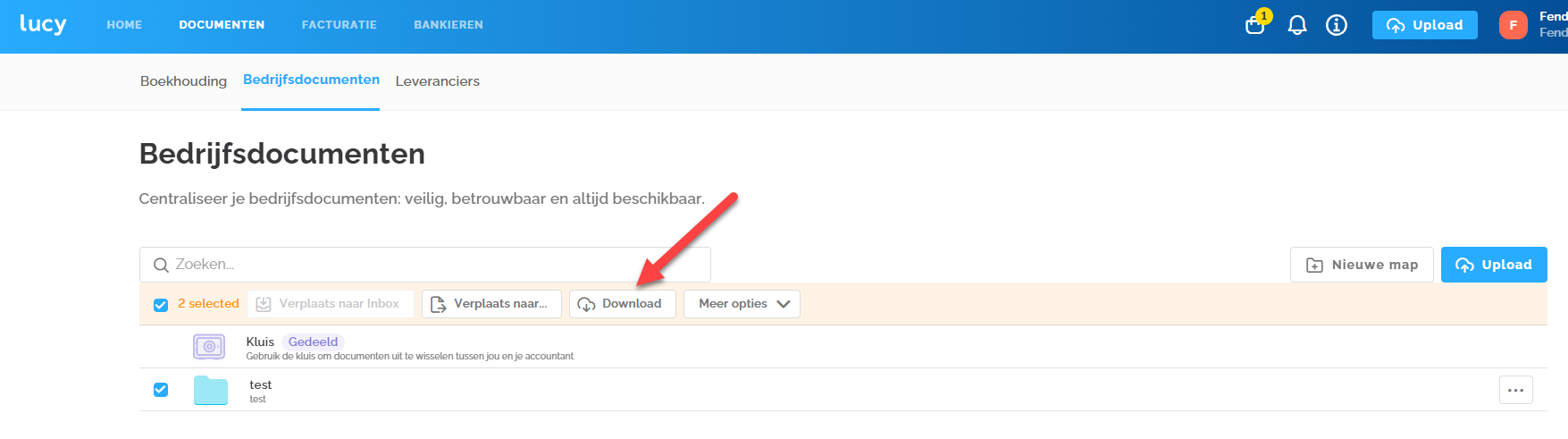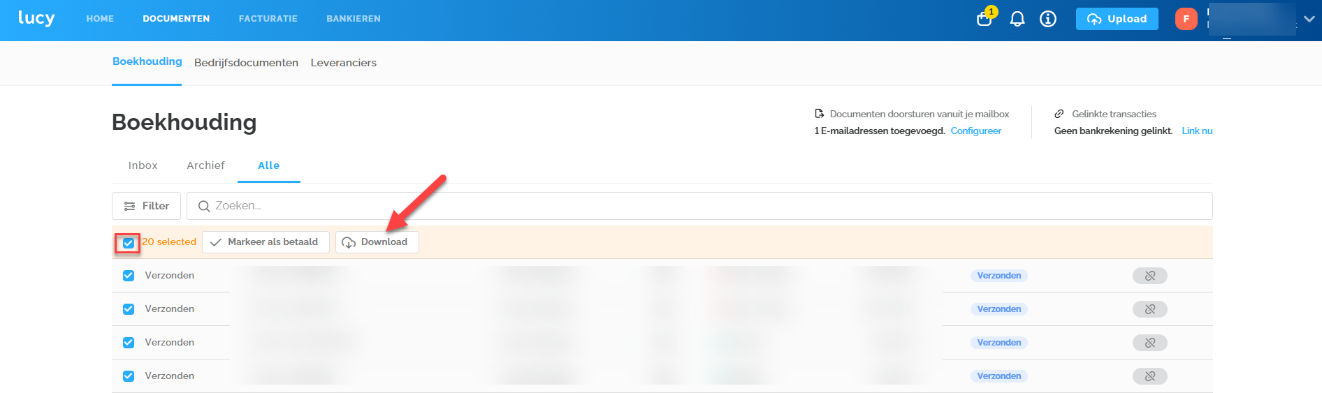 Ga bij Documenten naar Bedrijfsdocumenten. Vink het vakje links naast “naam” aan om alles te selecteren. Klik op Download.