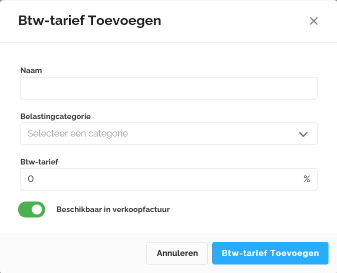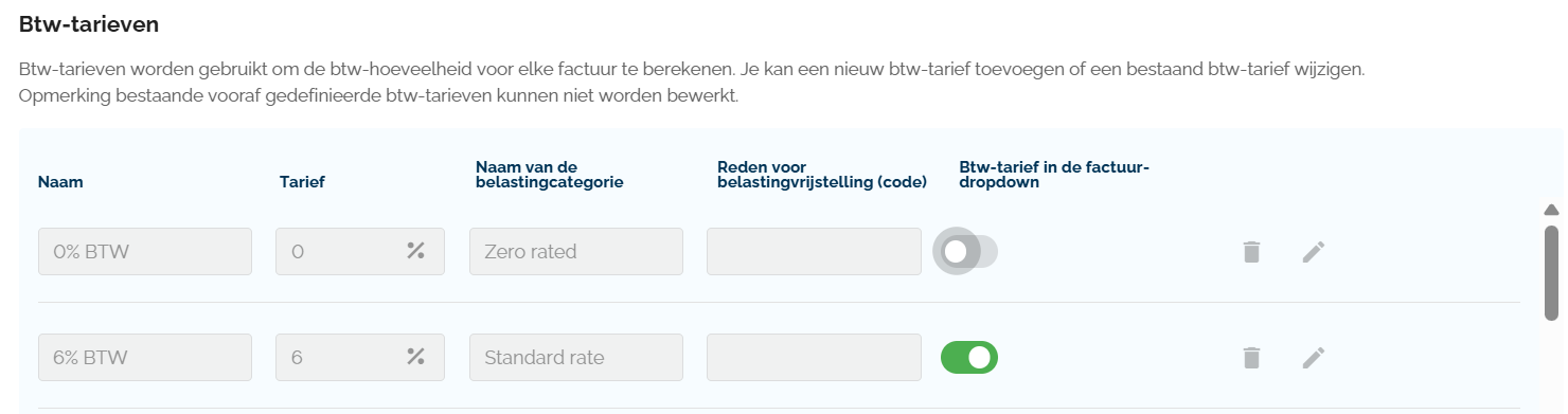 - Toggle: Gebruik deze schakelaar om te bepalen of dit btw-tarief direct als optie getoond wordt bij het opmaken van een factuur.